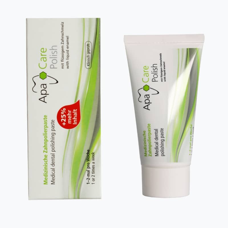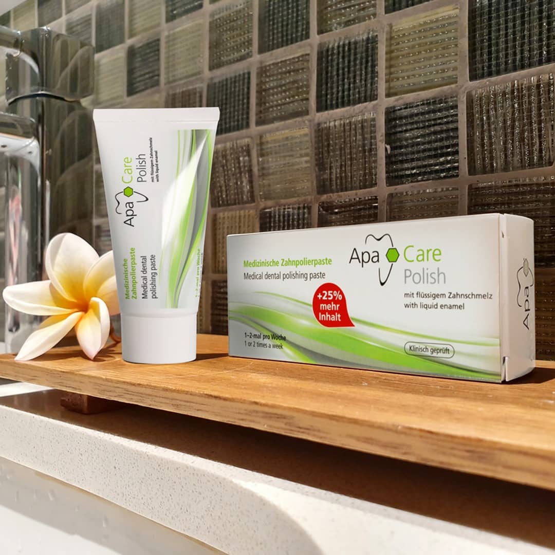 ApaCare Polish on poleerimispasta, mida suuhügienistid ja hambaarstid kasutavad ka kliinikus patsientide hammaste professionaalseks puhastuseks. Eemaldab põhjalikult kuid õrnalt kohvist, teest, punasest veinist, nikotiinist vms tekkinud plekid.